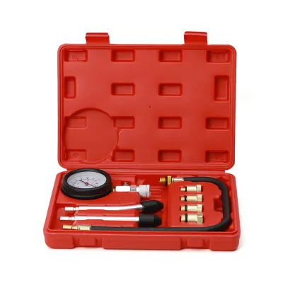 Le kit de testeur de compression du moteur contient : 1 jauge à boucle à ressort, 1 adaptateur d'extrémité de cône en caoutchouc droit, 1 adaptateur d'extrémité de cône en caoutchouc incurvé. Il y a un tuyau d'extension flexible de 16" de long avec 4 tailles (10 mm, 12 mm, 14 mm, 18 mm) d'adaptateurs en laiton sélectionnables dans le kit de test de compression du moteur.